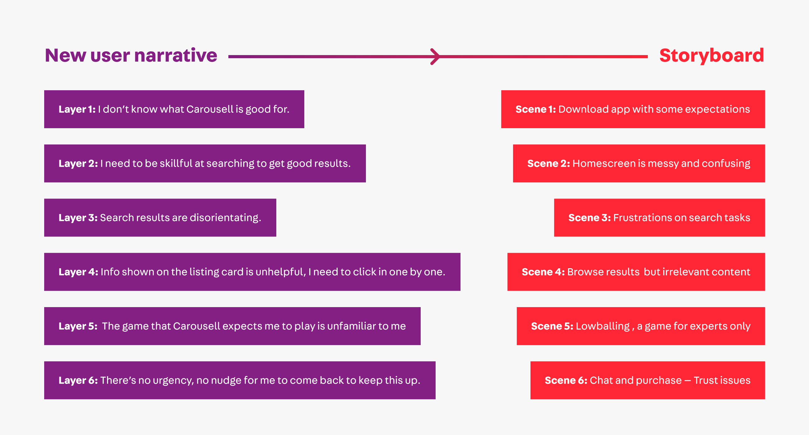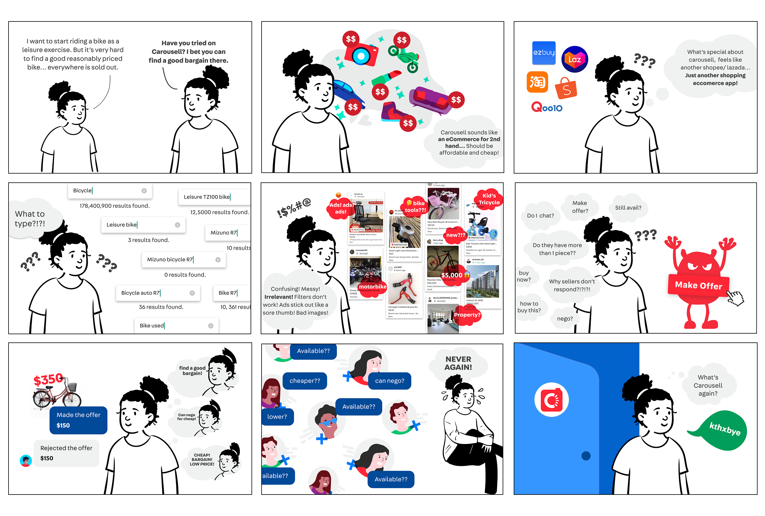 We categorised new buyer types to evaluate alignment between their goals and experience on Carousell—highlighting key behavioural patterns and usability gaps.